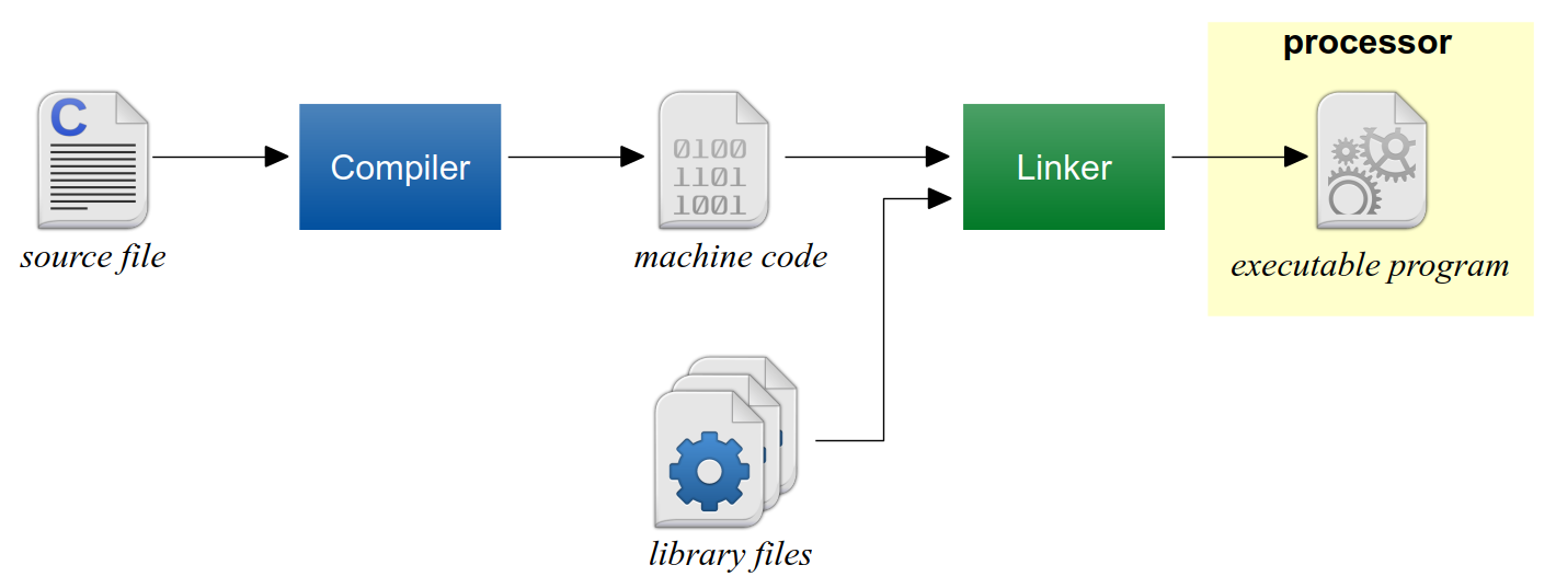 A second program called the linker takes the machine code produced by the compiler from your source file and pulls in the necessary components from the library to build an executable file which contains an executable program. Once produced, the executable program can be executed directly by the processor just like any other executable program on that computer.