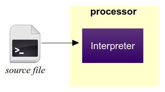 An interpreted language is one in which the source code is translated and executed by another program called an interpreter instead of directly by the processor. Interpreted languages are commonly used by a variety of applications for performing user-specified tasks or extending the capabilities of the application. Examples of interpreted languages include Javascript, bash, Basic, and lisp. This process is illustrated in Figure 1.5.2.