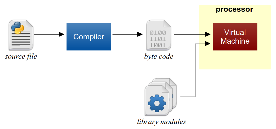 Some languages use a combined approach to take advantage of a compiler to translate the source code once while producing programs that are more portable across different types of processors. In this approach, both a compiler and a special type of interpreter are used. As illustrated in Figure 1.5.3, a compiler is used to translate the source code to byte code, which is similar to machine code, but designed and created for a virtual processor (or virtual machine) that executes on top of a the real processor. In this case, the virtual processor acts like an interpreter which executes the byte code instructions. Examples of these hybrid type languages include Java, Python, and C#. Languages that use this combined approach are considered compiled languages.