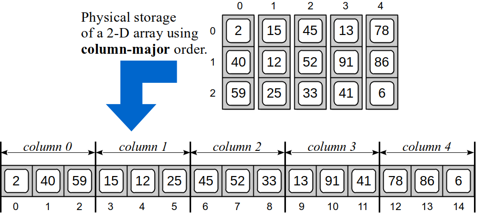 In column-major order, the 2-D array is stored sequentially, one entire column at a time, as illustrated in Figure 10.8.3. The first column of 3 elements are stored in the first 3 sequential elements of the 1-D array, followed by the 3 elements of the second column, and so on.