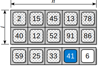 The column index, , is not only the offset within the given row but also the number of elements that must be skipped in the th row to reach the th column. To see this formula in action, again consider the 2-D array from Figure 10.8.2 and assume we want to access element . Finding the target element within the 1-D array requires skipping over the first 2 complete rows of elements: