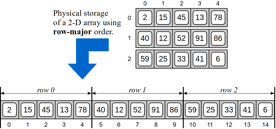 In row-major order, the individual rows are stored sequentially, one at a time, as illustrated in Figure 10.8.2. The first row of 5 elements are stored in the first 5 sequential elements of the 1-D array, the second row of 5 elements are stored in the next five sequential elements, and so forth.