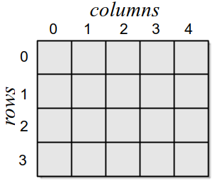 Some problems require the use of a two-dimensional array, which organizes data into rows and columns similar to a table or grid as illustrated in Figure 10.1.1. The individual elements are accessed by specifying two indices, one for the row and one for the column.